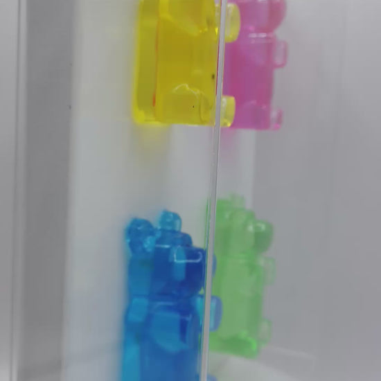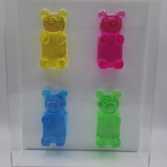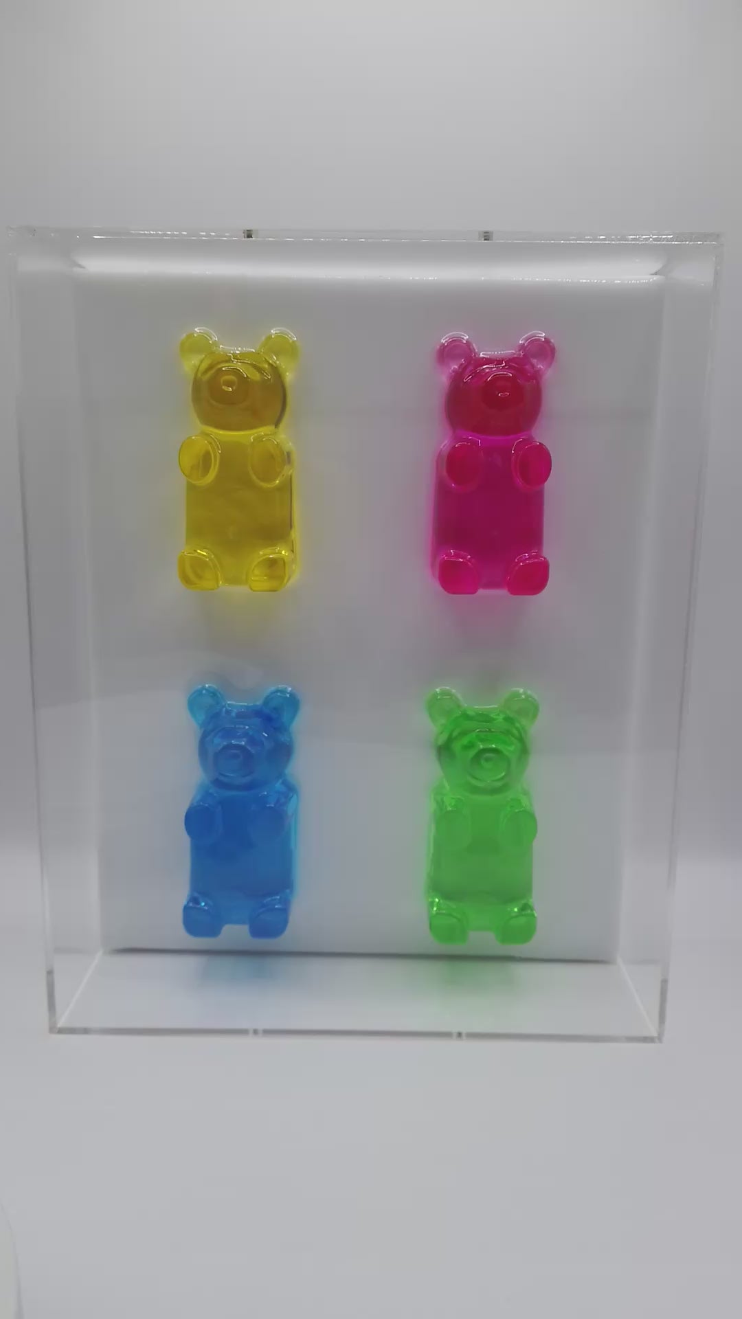 NEW ITEM! (4) 3" Gummy Bears in Multicolor w/enclosed canvas shadow box Acrylic frame.